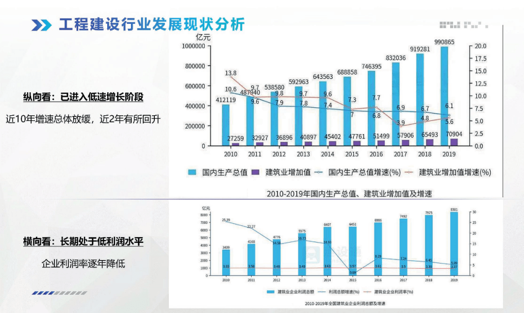 經(jīng)過對(duì)近十年數(shù)據(jù)的對(duì)比分析,可以看出建筑業(yè)作為國(guó)民經(jīng)濟(jì)支柱產(chǎn)業(yè)之一,地位依舊穩(wěn)固。但是如何擺脫利潤(rùn)率偏低的現(xiàn)狀、如何提高企業(yè)競(jìng)爭(zhēng)力成為了當(dāng)今需要探討的問題。