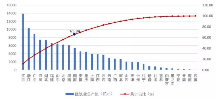 除江蘇、浙江外,總產值超過5000億元的還有廣東、四川、湖北、福建、山東、北京、河南、湖南8個地區,上述10省市完成的建筑業總產值占全國建筑業總產值的65.94%(圖1)。