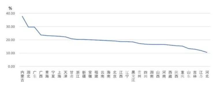 從外向度(即本地區在外省完成的產值占本地區建筑業總產值的比例)來看,排在前三位的地區是北京、天津和上海,分別為74.76%、62.56%、60.44%。此外,外向度超過30%的還有青海、福建、湖北、江蘇、內蒙古、陜西、河北、山西、湖南、遼寧、江西、福建、廣東等13個地區(圖4)。
