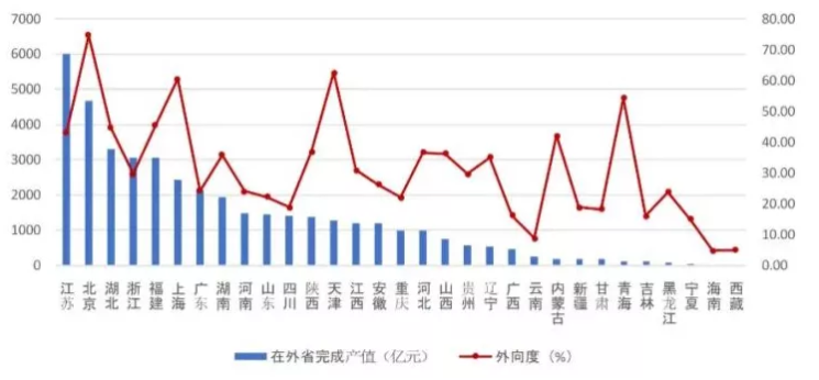 圖4 2021年上半年各地區跨省完成的建筑業總產值及外向度