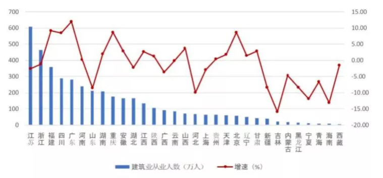 圖5 2021年上半年各地區建筑業從業人數及其增長情況